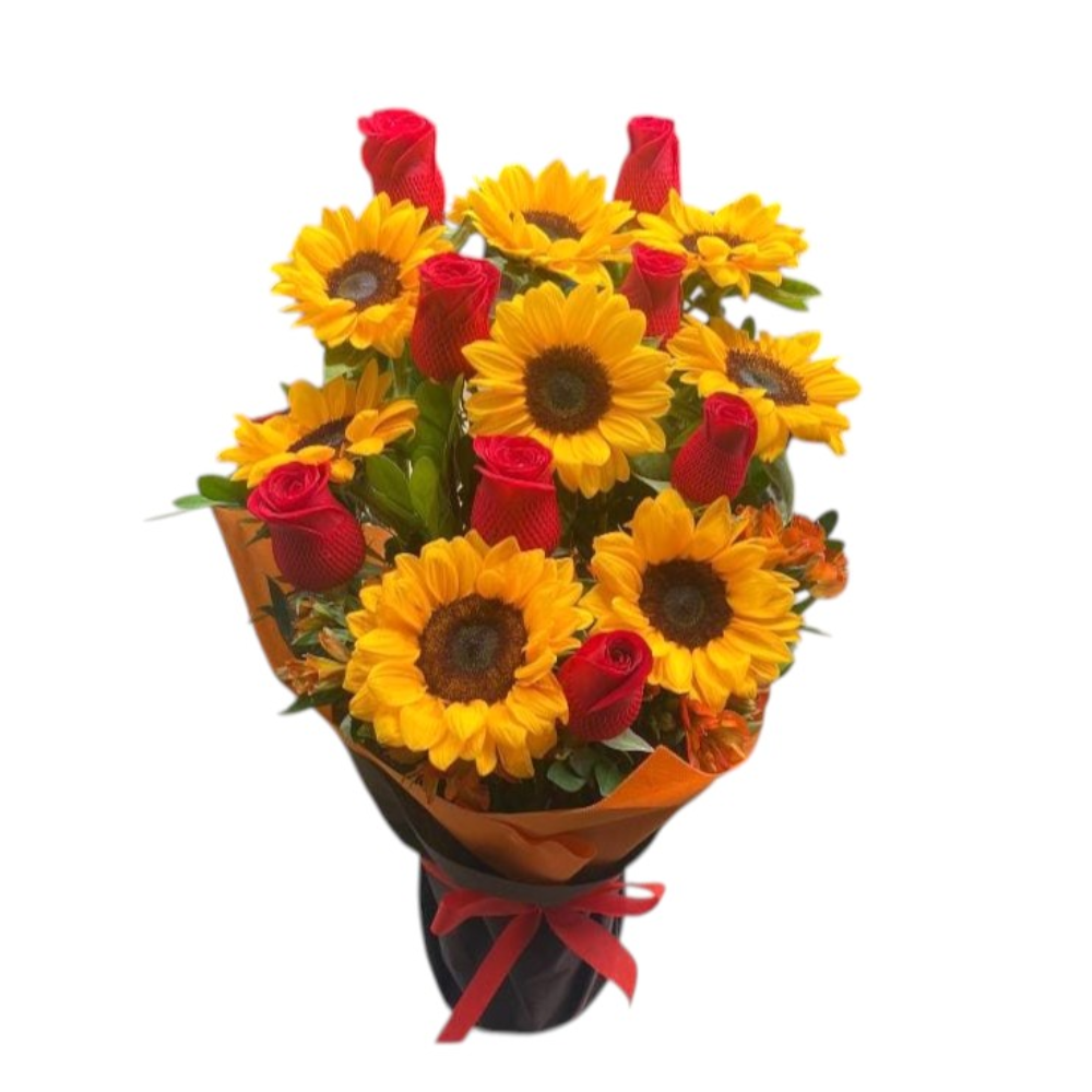 Arreglo de girasoles y rosas, incluye una tarjeta personalizada y un globo pequeño