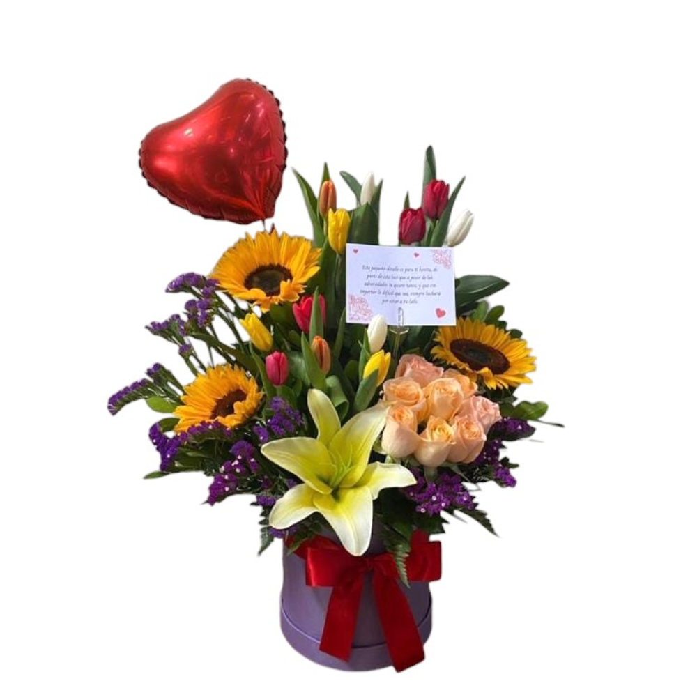 Box primaveral de rosas, tulipanes, lirios y finos follajes florales con tarjeta dedicatoria