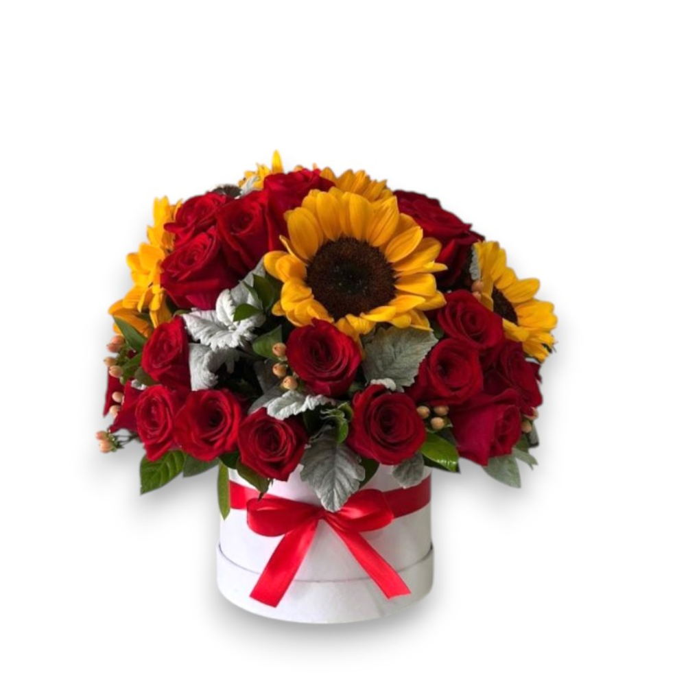 Box de rosas y girasoles, incluye una tarjeta personalizada y un globo pequeño