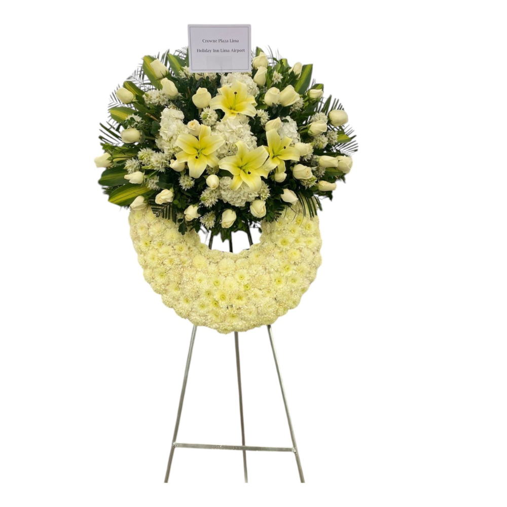 Corona de rosas blancas, lirios, hortensias y fino follaje