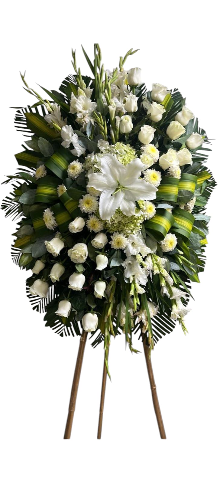 Corona de rosas blancas, arañitas, hortensias y fino follaje