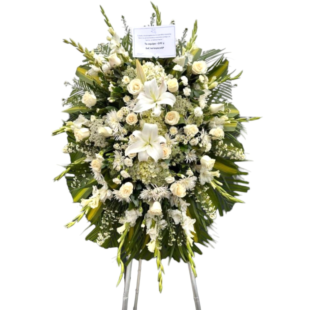 Corona de lirios, rosas blancas, arañitas, fino follaje y tarjeta dedicatoria