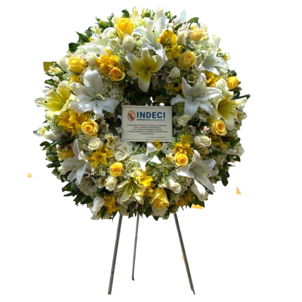 Corona de rosas, lirios, hortensias, tarjeta dedicatoria y fino follaje