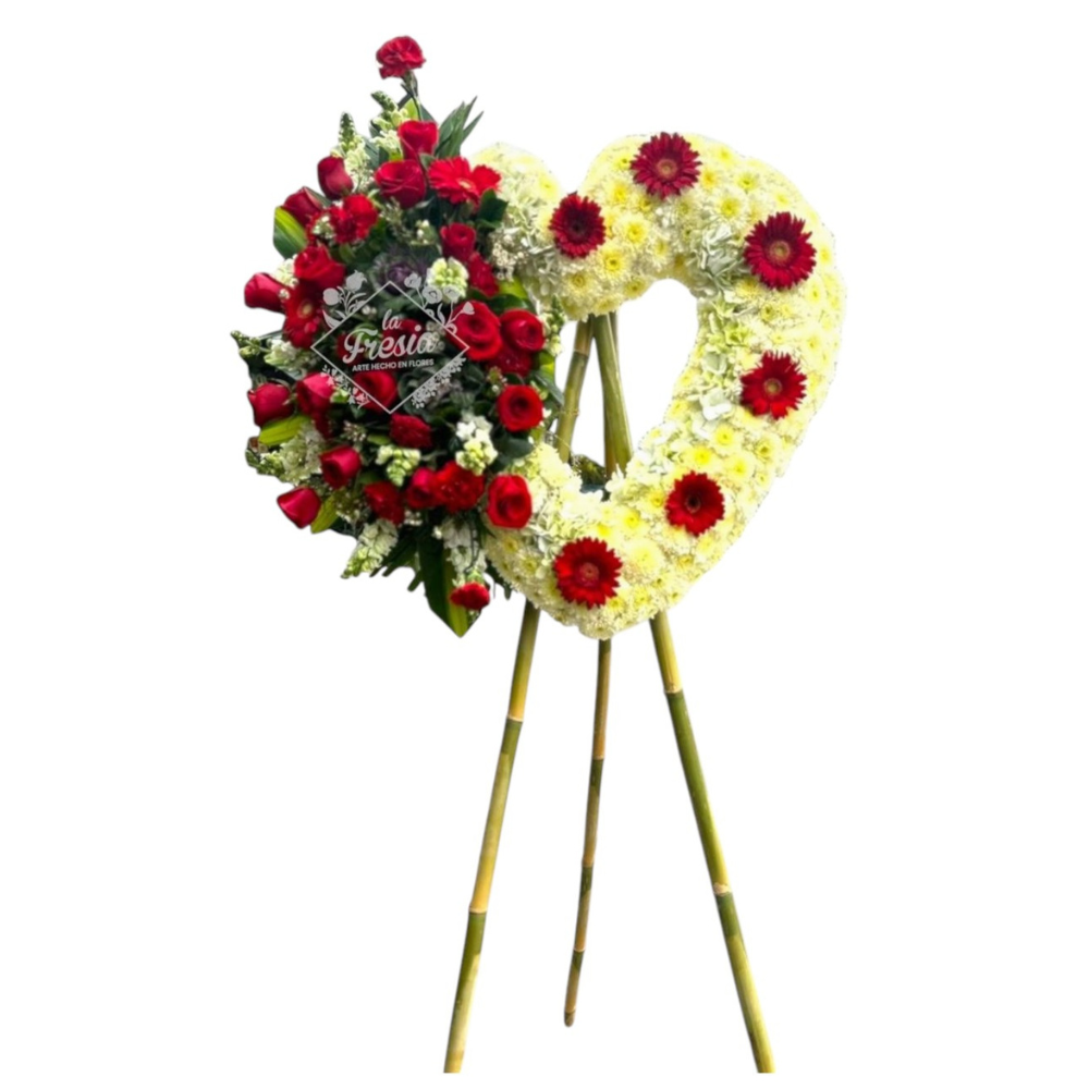 Corona en forma de corazón con gerberas, rosas rojas y fino follaje