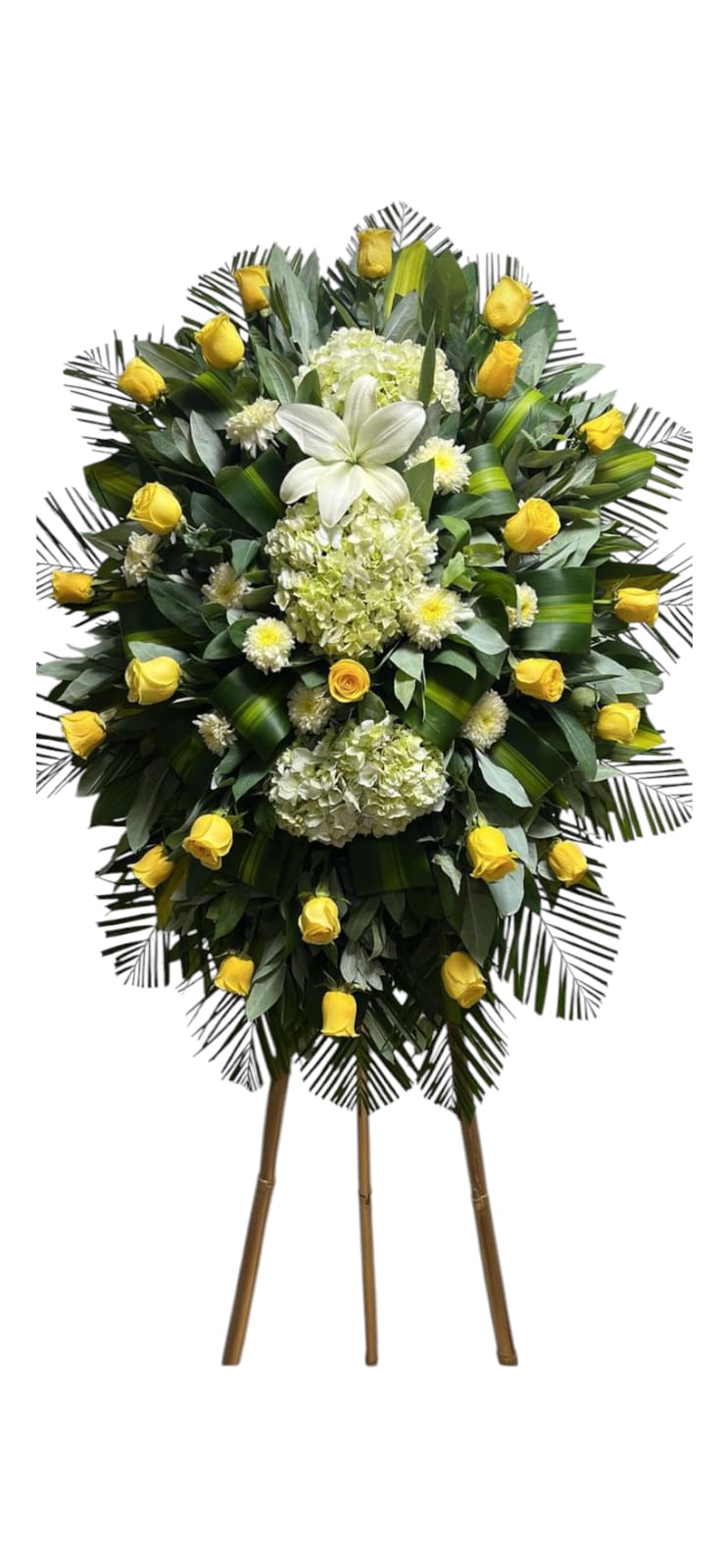 Corona de rosas amarillas, hortensias, arañitas y fino follaje