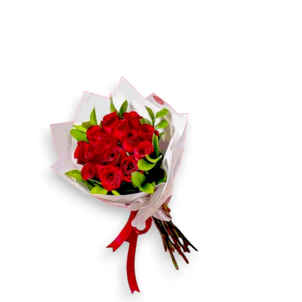 Ramo de 12 rosas en envoltura coreana, incluyendo una tarjeta personalizada y un globo pequeño.